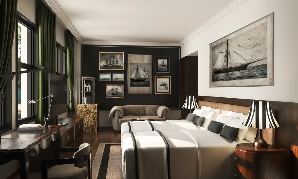 黑白航海圖與深色牆面交織出的靜謐,讓每一次入睡,都像是在閱讀一段橫跨海洋的歷史。