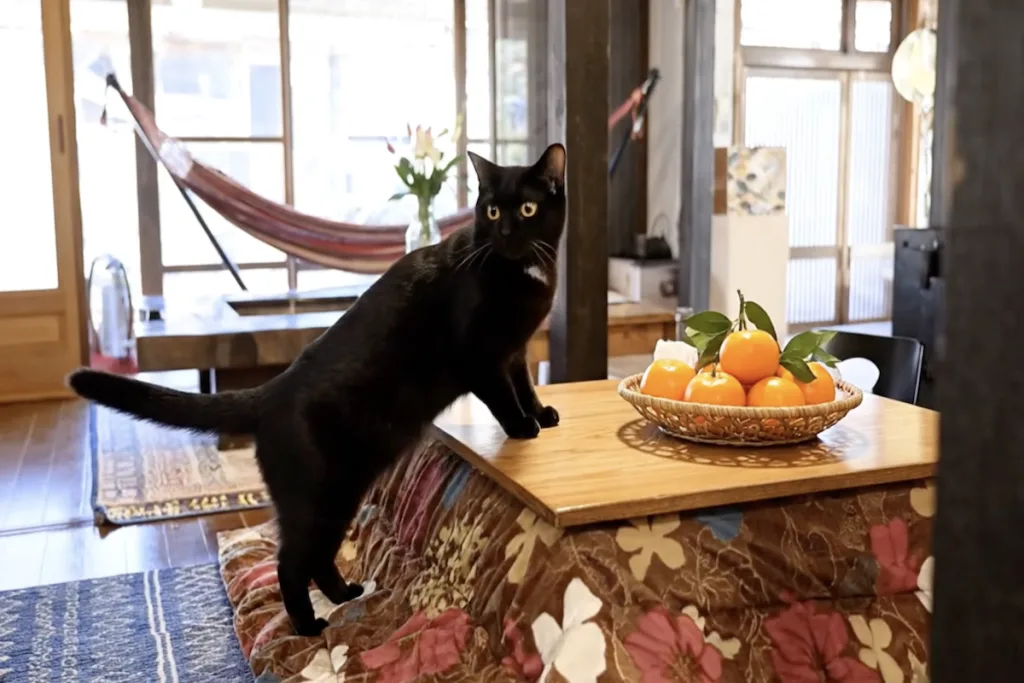 目前的冬季限定活動——「暖桌與蜜柑祭」(至 2 月底)。躲進日本傳統的暖桌裡,一邊剝著當地產的甜美橘子,一邊感受貓咪鑽進被窩裡的重量。
