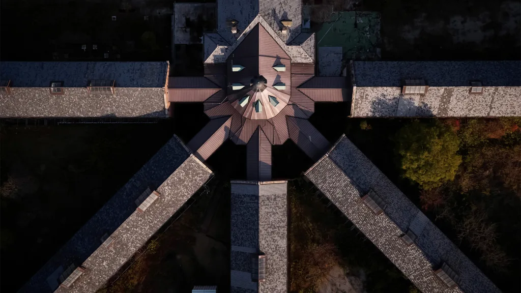 俯瞰建築主體,採用嚴謹的「哈維蘭德系統(Haviland System)」:五棟收容樓以中央監視塔為核心呈放射狀延伸,展現了幾何秩序。這種源於「全景敞視」的監控結構,如今轉化為具備歷史價值的紅磚建築群,見證了明治維新時期的現代化進程。